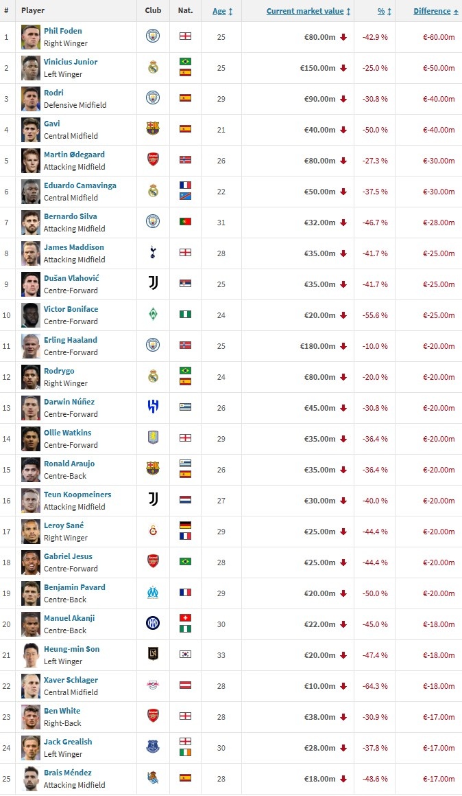 2025年球员身价下降榜:福登身价下降6000万欧最多,维尼修斯次席